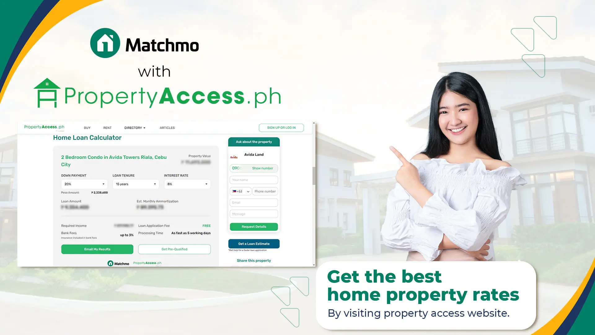 Search for the best apartments and houses and lots for sale in the Philippines and start accessing your dream home and your next property investment with PropertyAccess Philippines & skip the search for the best home loan rates with Matchmo.